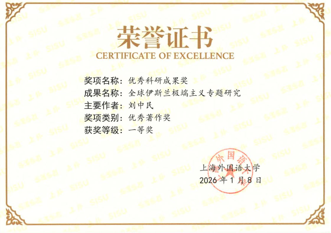 根据《上海外国语大学优秀科研成果奖评奖办法》(上外科(2025)4号),经个人申报、院系初审、通讯评审、会议复审,经校长办公会审议通过和拟获奖成果公示,中东研究所刘中民教授等著《全球伊斯兰极端主义专题研究》获2025年度上海外国语大学优秀科研成果奖优秀著作奖一等奖。