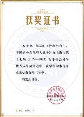 近日,上海外国语大学中东研究所资助出版的专著《控制与自主:美国的中东代理人战争》(文少彪,中国社会科学出版社2023年7月版)荣获上海市第十七届哲学社会科学优秀成果奖著作类二等奖。