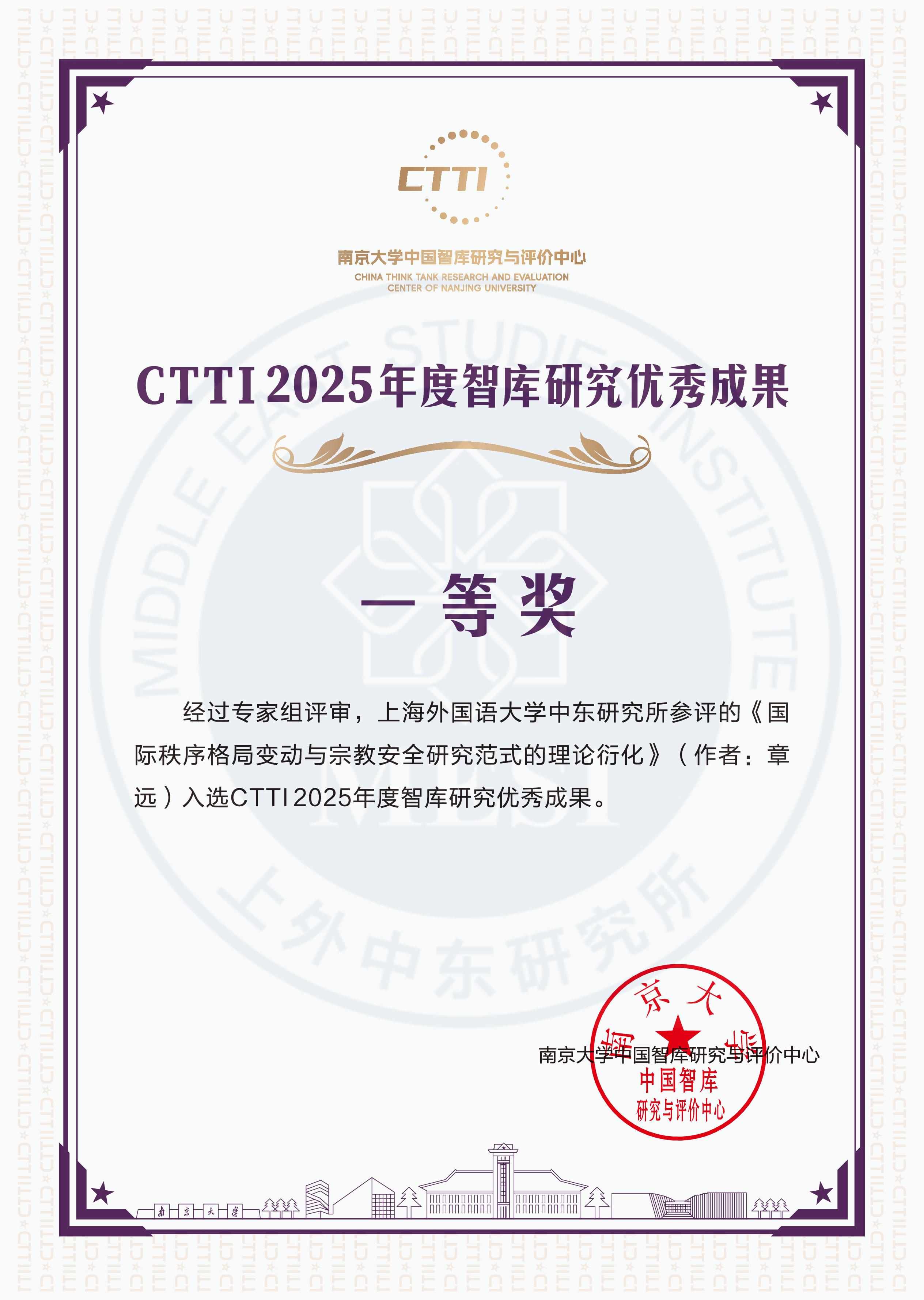 根据南京大学中国智库研究与评价中心《关于公布CTTI2025年度智库建设最佳案例与智库研究优秀成果推介名单的启事》,上海外国语大学中东研究所报送的研究论文《国际秩序格局变动与宗教安全研究范式的理论衍化》(作者:章远,原载《世界宗教研究》2025年第1期)荣获一等奖。