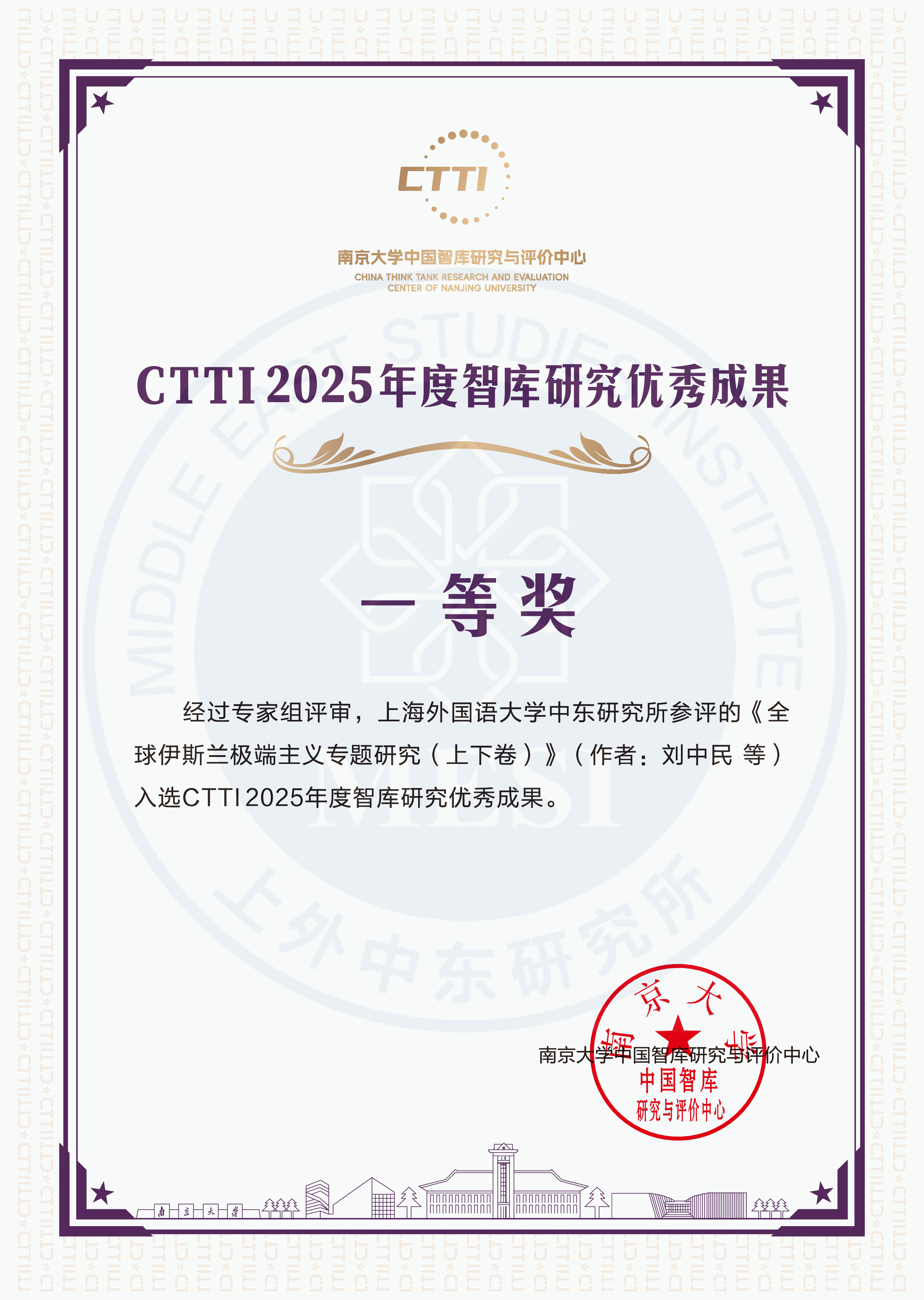 根据南京大学中国智库研究与评价中心《关于公布CTTI2025年度智库建设最佳案例与智库研究优秀成果推介名单的启事》,上海外国语大学中东研究所报送的学术专著《全球伊斯兰极端主义专题研究》(上卷、下卷)(作者:刘中民等,世界知识出版社2024年11月版)荣获一等奖。