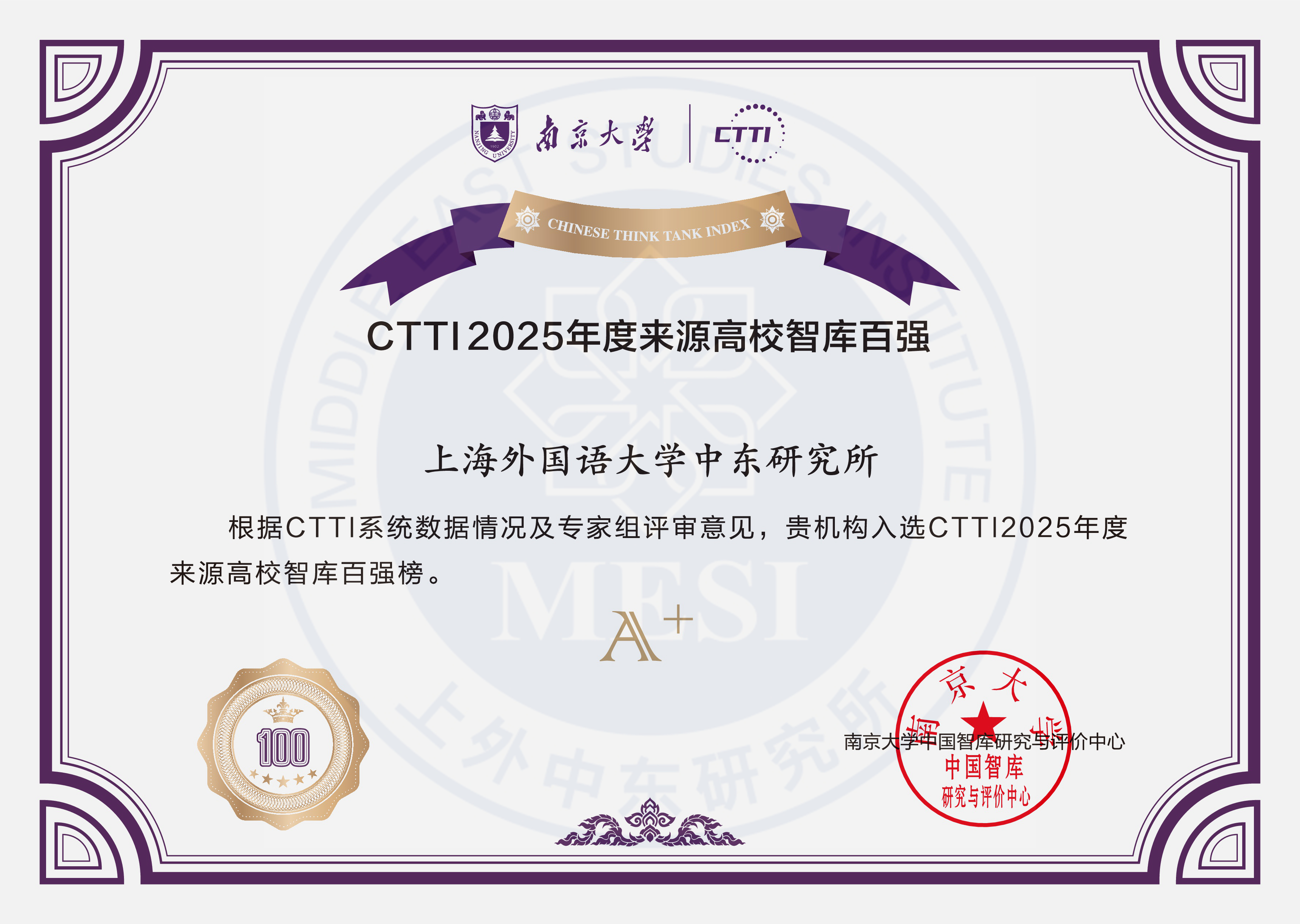 “2025CTTI高校智库百强榜”推介工作旨在系统总结高校智库建设成果,深入剖析发展态势与演化趋势,助力政策优化与资源引导,通过展示100家具有典范意义的高校智库在建设理念、研究机制、成果应用等方面的成功经验,发挥示范引领作用,为全国高校智库提供可对照、可借鉴、可复制的建设经验,助推智库整体跃升发展。遴选采用的“PAI-E”综合得分办法是指围绕智库产品(Product)、智库活动(Activity)、智库媒体影响(Impact)、专家评价(Expert)等四个维度计算各家高校得分。该榜单迄今共发布三次,上海外国语大学中东研究所均荣誉入围:2018年为A等级,2022年为A+等级,2025年为A+等级。